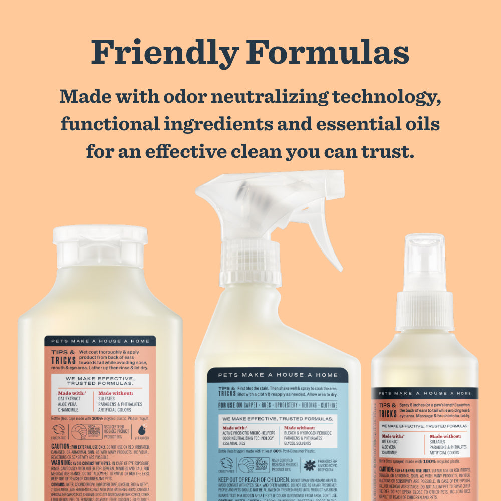 This hardworking bundle features three grooming and cleaning products for the four-legged friend (or new paw-rent!) in your life: 3-in-1 Dog Shampoo. Dog Deodorizing Spritz. and Pet Stain & Odor Fighter. Our grooming products are veterinarian tested and pH balanced specifically for dogs. while our cleaning products are made with odor neutralizing technology and our special formula of active probiotic micro-helpers to tame messes and smells right at the source.