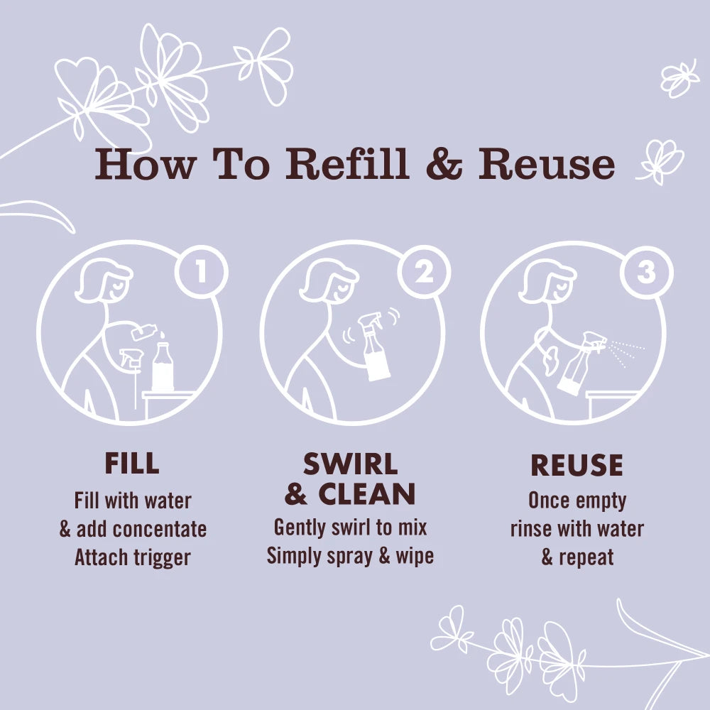 - This concentrated refill can be used to refill the glass bottle or our single use Multi-Surface Everyday Cleaner bottles