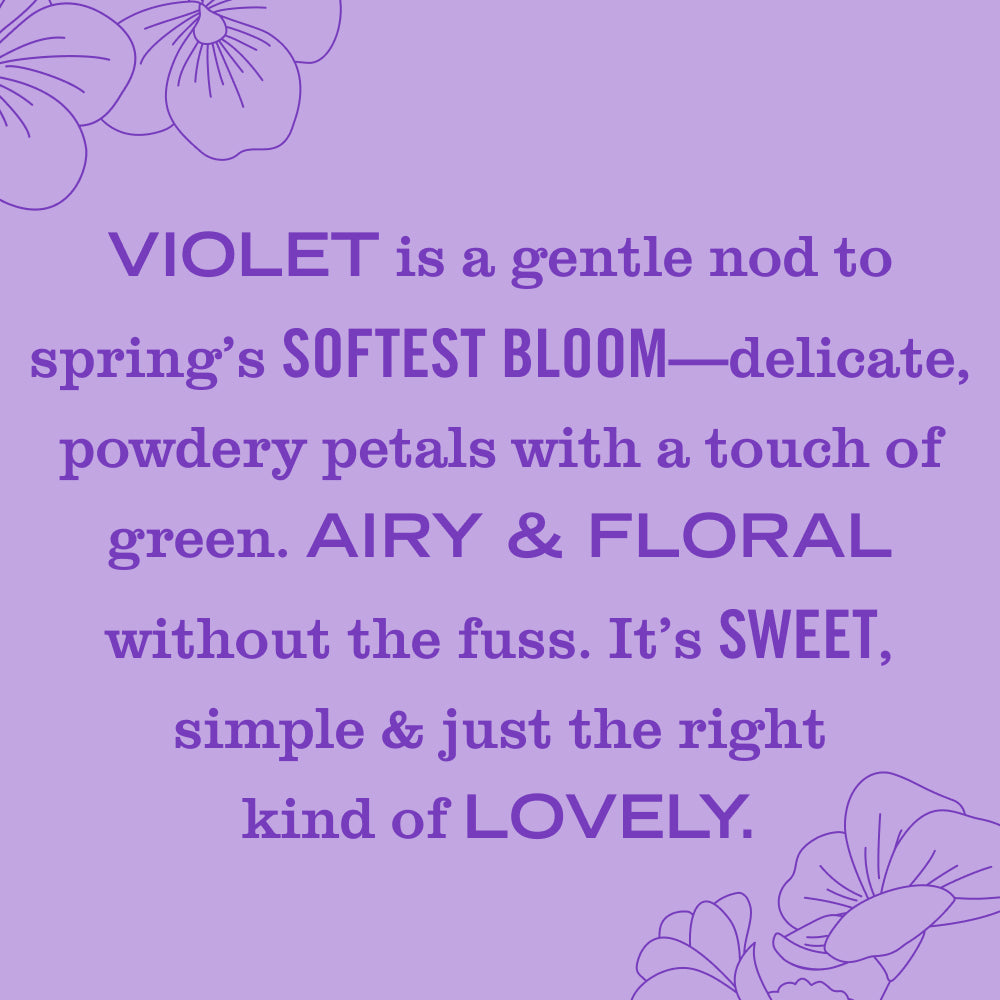 • Violet is a gentle nod to Spring’s softest bloom—delicate. powdery petals with a touch of green. Airy and floral without the fuss. It’s sweet. simple. and just the right kind of lovely.
